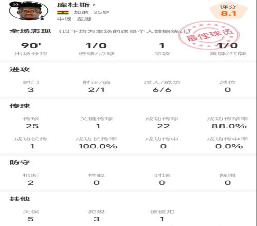 库杜斯vs利兹联全场数据:贡献1球1助,6次过人全部成功